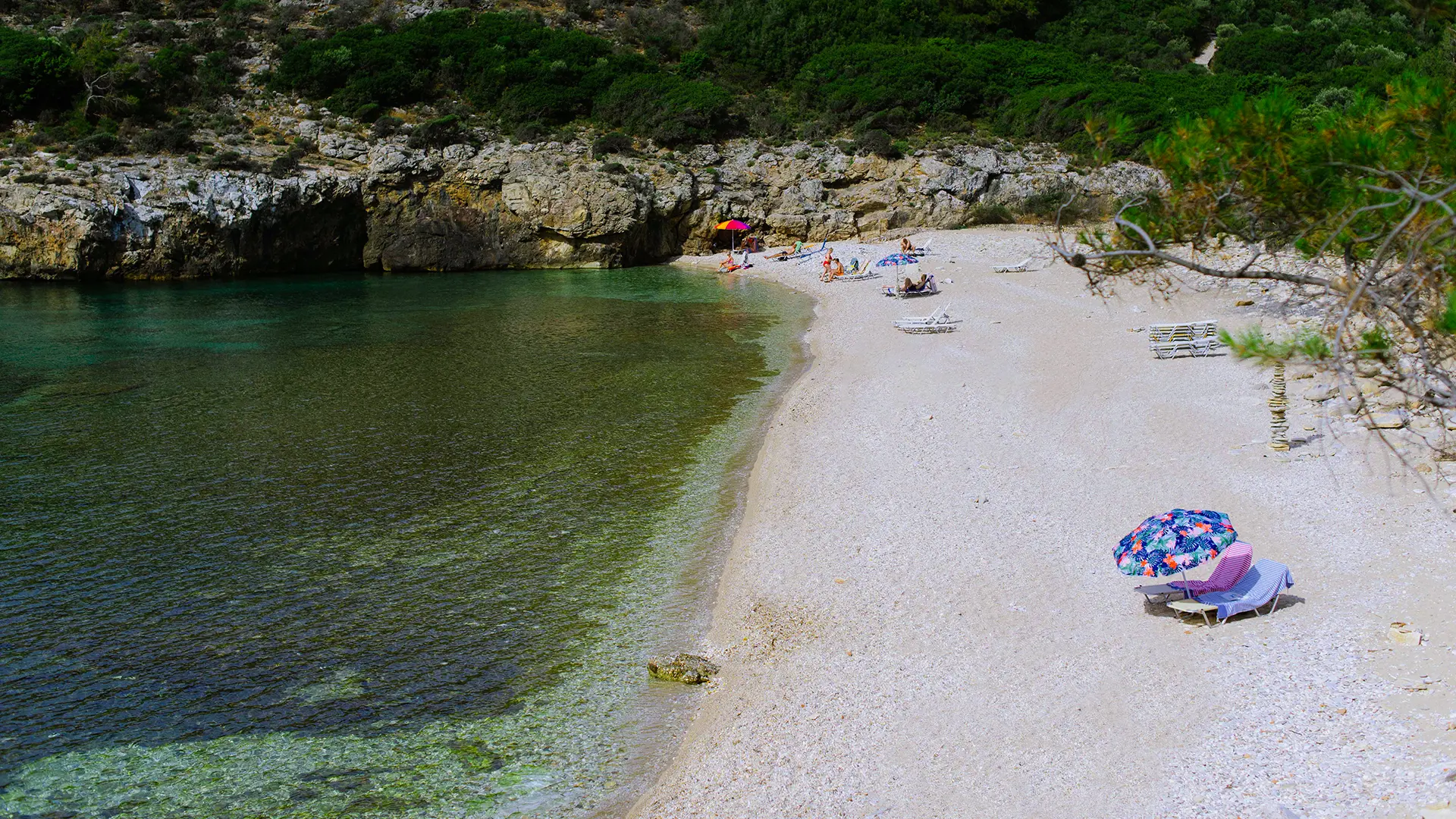 The beach has a rock-strewn entrance to the sea, which is very shallow, but after the stony area finishes, the water becomes deeper and perfect for snorkeling. These underwater rocks are not sharp, but they are slippery, and some sea urchins live there, so it is good if you bring swimming shoes with you. Also, get plenty of water and snacks to keep you going during your stay because there are no extra amenities except for the umbrellas and sunbeds provided by the hotel. Last but not least, if you feel adventurous enough, combine your visit to Kalami Beach with a dive at Giola Lagoon. Just note that both beaches require walking and are not easily accessible to everyone.
